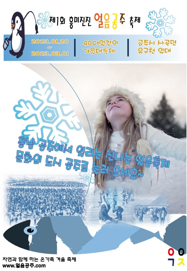 충청남도 공주시 유구천에서 열리는 '제1회 흥미진진 얼음공주' 축제는 겨울 축제의 하나로서, 올해 첫1회를 맞이하는 이색 겨울 축제입니다. 그동안의 얼음 낚시 축제가 강원도와 경기도 북부지역에서만 개최 되었는데 2023년 01월 충청남도 공주에서 얼음축제(얼음낚시와 기타놀이 등)가 개최가 되며, 유네스코 세계유산의 도시 공주에서는 마곡사, 공산성 등 유명 관광지도 둘러볼 수 있습니다.